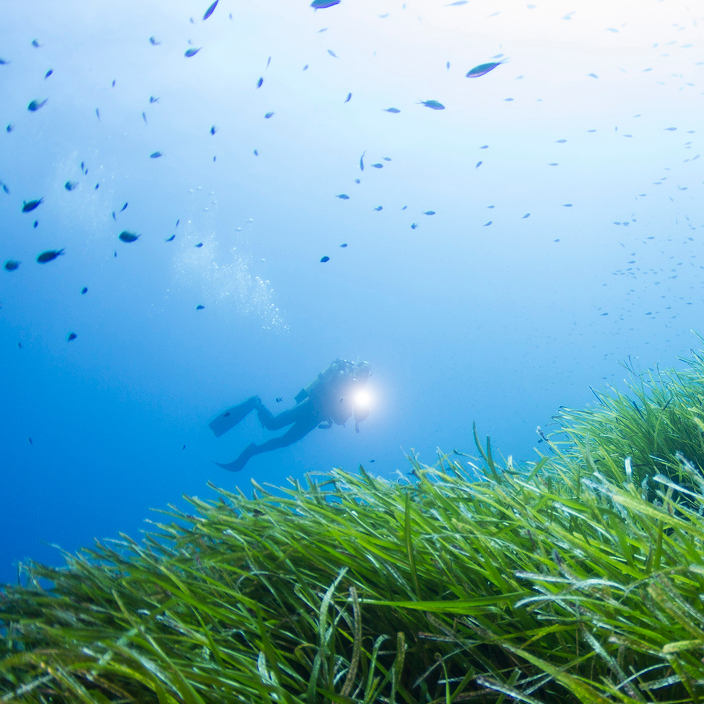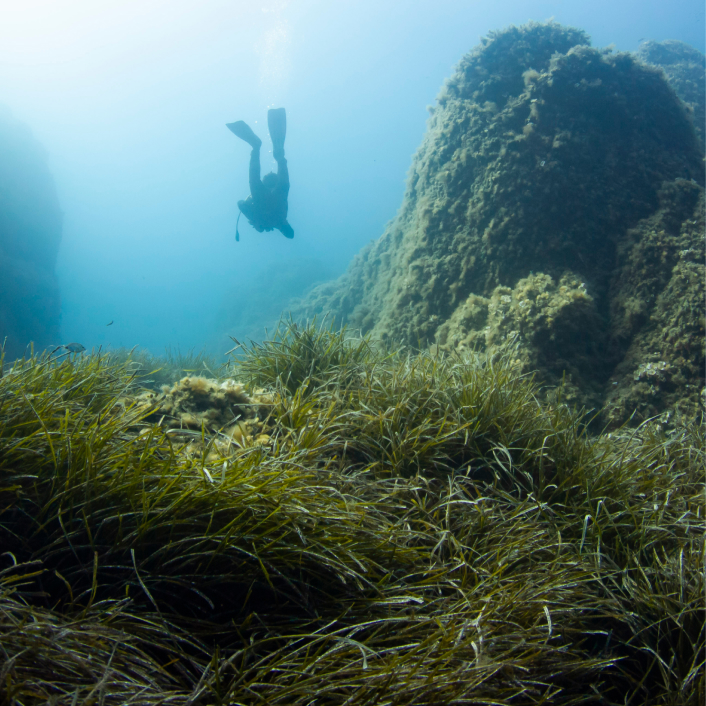 Entre estas aguas claras también se encuentran praderas de posidonia —protegida en Baleares—, uno de los grandes tesoros del Mediterráneo.